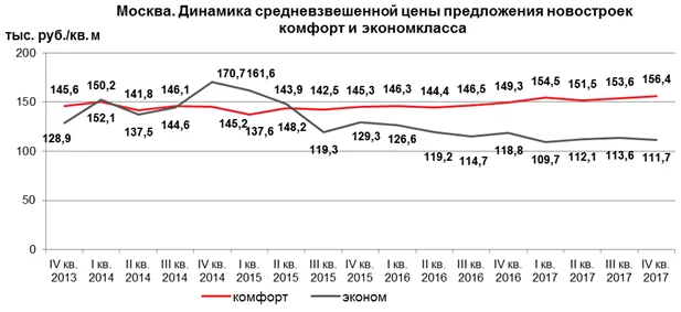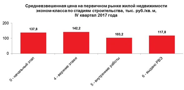 Тенденция роста обусловлена высокими темпами строительства и, как следствие, увеличением стадии готовности в масштабных проектах, вышедших в течение 2016-2017 гг. В годовой динамике показатель средневзвешенной цены эконом-класса, напротив, сократился на 5,9%.