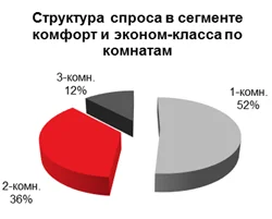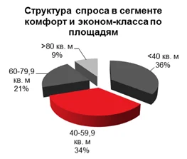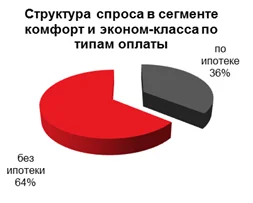 В сегментах эконом и комфорт наибольшим спросом пользовались однокомнатные (52% от общего спроса) и двухкомнатные (36%) квартиры. Доля сделок с привлечением ипотечного кредитования в текущих условиях рынка составила 36%.