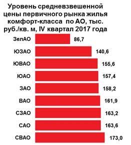 Наиболее высокая цена в сегменте комфорт относится к СВАО Москвы, она составила 173,0 тыс. руб./кв. м. Бюджетные квартиры традиционно представлены в Зеленограде, 86,7 тыс. руб./кв. м.