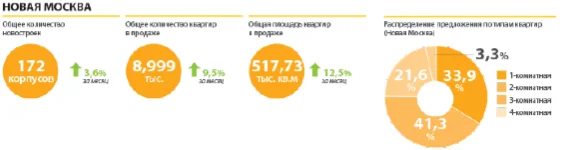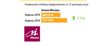 По данным департамента аналитики «МИЭЛЬ-Новостройки» в Новой Москве в апреле 2019 года отмечен рост объемов предложения. В апреле в ТиНАО новые проекты на продажу не выходили, предложение пополнилось 11 новыми корпусами. Суммарный объем предложения на первичном рынке вырос на 12,5% и составил 517,7 тыс. кв. метров.