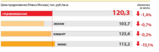 В сегменте экономкласса средневзвешенная цена за месяц снизилась на 0,7% и составила 103,7 тыс. рублей за кв. метр. В сегменте комфорт класса цена потеряла 0,2% и достигла значений 123,6 тыс. рублей за кв. метр. Средневзвешенная цена новостроек бизнес-класса в апреле снизилась на 13,1% и составила 112,2 тыс. рублей за кв. метр.