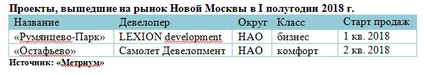По данным компании «Метриум», за первое полугодие 2018 года на первичный рынок жилья Новой Москвы вышли два новых проекта. В совокупности объем предложения в июне составил порядка 8400 квартир (площадью 451,9 тыс. кв. м) в 36 комплексах.