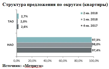 Наибольшая доля квартир в продаже приходится на Новомосковский административный округ – 97,3% (-0,1 п.п.). В ТАО соответственно реализуется 2,7% (+0,1 п.п.) предложения.