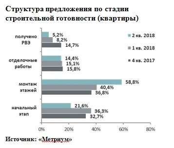 В первом полугодии 2018 года более половины всех квартир в локации реализовывались в корпусах на этапе монтажа этажей – 58,8% (+22% п.п.). Рост обусловлен как повышением строительной готовности уже находящихся в продаже домов, так и выводом на рынок новостроек на стадии монтажа этажей. Соответственно, доля квартир в корпусах на начальном этапе строительства сократилась и составила 21,6% (-11,1% п.п.). Лоты в домах на стадии отделочных работ и в уже введенных в эксплуатацию зданиях заняли 14,4% (-1,4 п.п.) и 5,2% (-9,5 п.п.) соответственно.