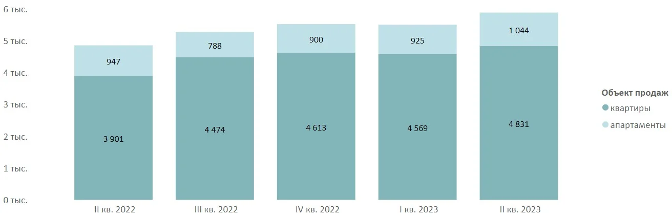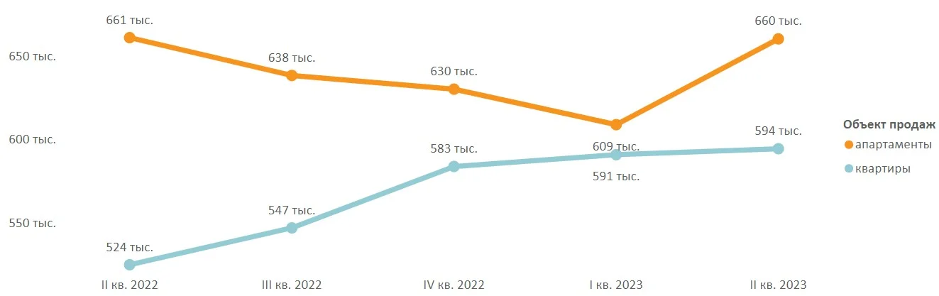 По подсчетам аналитиков «Метриум», средневзвешенная цена кв. метра на конец июня 2023 года составила 606 160 руб. (+2,1% за квартал, +2,5% за полгода, +8,3% за 12 месяцев). Апартаменты в среднем дороже квартир, к концу полугодия разница между типами недвижимости выросла до 10%.