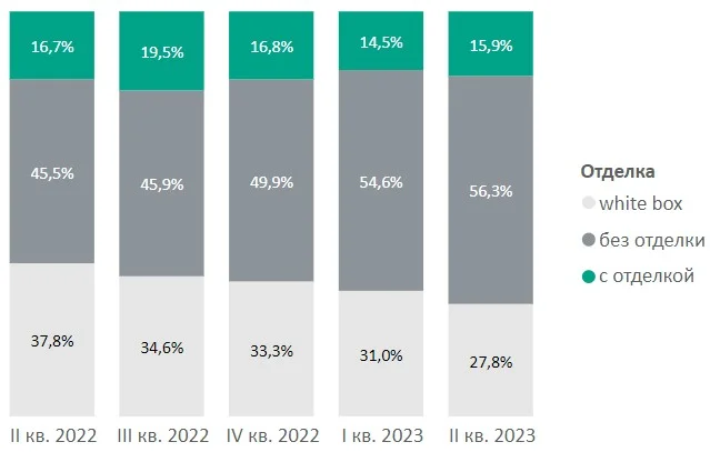 В премиальных квартирах и апартаментах чаще всего отделка не предусмотрена (56,3% вариантов, +6,4 п.п. за полугодие). Доля предложений с отделкой white box уменьшается (27,8%, -5,5 п.п.), как и с чистовой отделкой (15,9%, -0,9 п.п.).