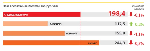 В сегменте экономкласса средневзвешенная цена снизилась на 0,4% (до 87,8 тыс. р./кв. м). В сегменте комфорт-класса цена выросла на 2,0% и достигла значений 99,5 тыс. р./кв. м. Средневзвешенная цена бизнес-класса снизилась на 0,1% до 127,5 тыс. р./кв. м.