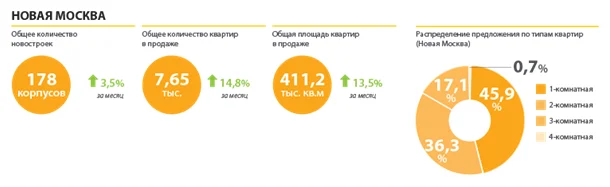 Доля бизнес-класса в старых границах Москвы за последние четыре месяца, по данным компании «Миэль-Новостройки», выросла на 5 п. п. (с 47,9% по итогам октября 2017 г. до 52,9% по итогам февраля 2018 г.). Рост предложения бизнес-класса привел к увеличению средней площади выставленных на продажу лотов на 0,7% до 65,8 кв. м. В целом, объем предложения на первичном рынке Москвы вырос на 0,6% и составил 2,8 млн кв. метров.