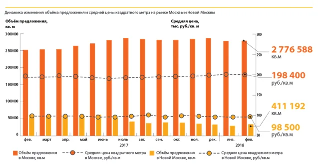 По данным базы объектов компании «Миэль-Новостройки», совокупный объем предложения на первичном рынке жилья Москвы в старых границах по итогам февраля 2018 г. составил 2,8 млн кв. м (без учета элитных объектов). По сравнению с январем 2018 г. зафиксирован рост на уровне 0,6%.