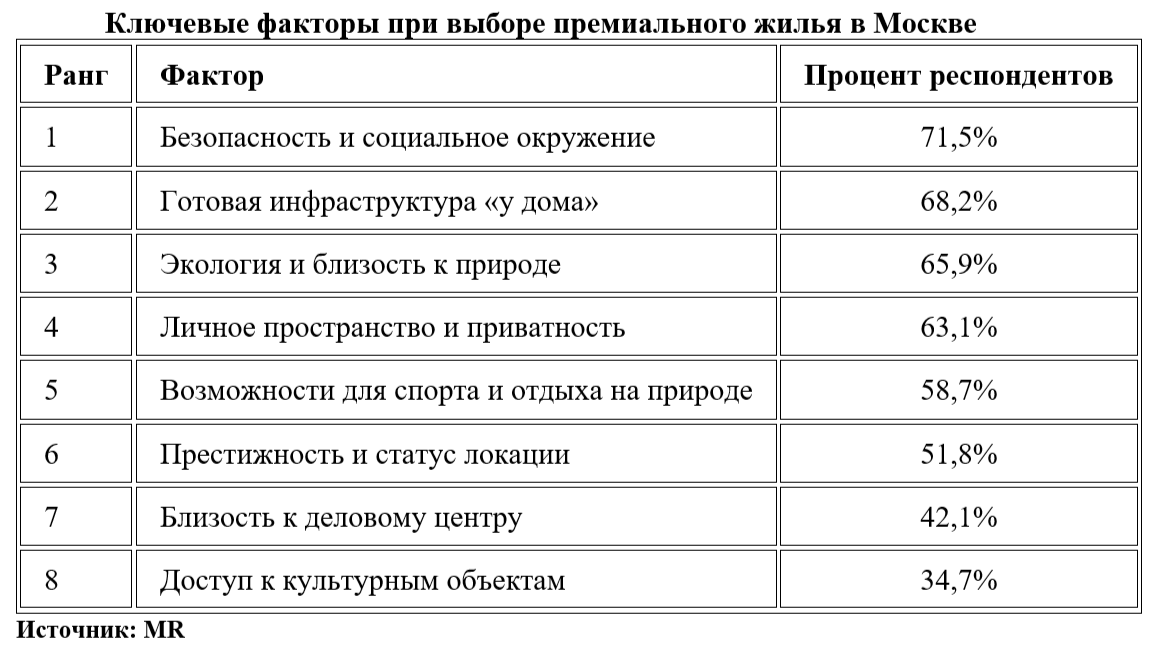 Примечательно, что вся первая пятерка наиболее острых потребностей так или иначе связана с пространством, экологией и возможностью уединения. Первый «урбанистический» запрос – «шаговая доступность к топ-ресторанам» – появляется лишь на шестой позиции с 50,8%. Таким образом, премиальный покупатель начинает искать то, что город дать ему не в силах, – приватность, спокойствие и ежедневный контакт с природой.