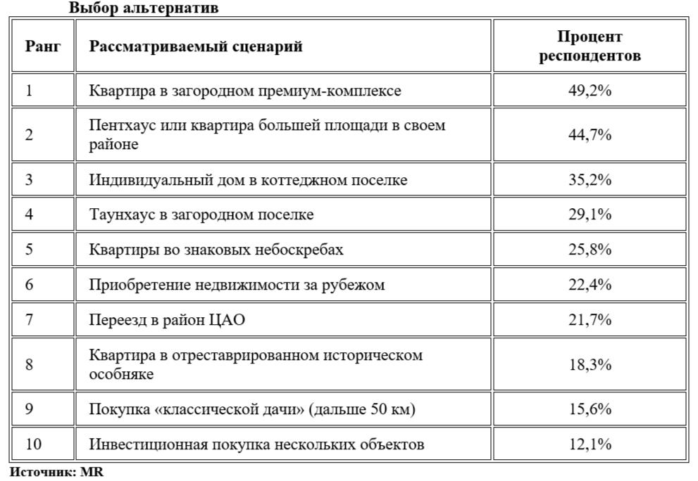 На третьем этапе исследования респондентам предложили выбрать до трех наиболее привлекательных для них сценариев решения жилищного вопроса из десяти, помимо покупки квартиры в городской премиальной новостройке. Самым популярным вариантом оказалась квартира в загородном премиум-комплексе – ее готовы рассматривать 49,2% респондентов. Этот сценарий стал более привлекательным, чем приобретение пентхауса или квартиры большей площади в городе (44,7%). То есть, выбирая между лишними квадратными метрами и возможностью жить в природном окружении, респонденты склоняются ко второму.