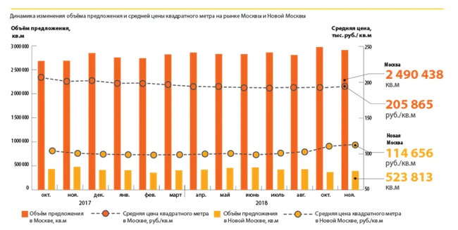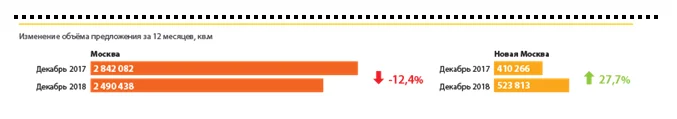 По итогам декабря 2018 года совокупный объем предложения на первичном рынке жилья в старых границах Москвы, по данным департамента аналитики компании «МИЭЛЬ-Новостройки», составил 2290 тыс. кв. метров (без учета элитных объектов). По сравнению с ноябрем 2018 года зафиксировано снижение на уровне 3%.