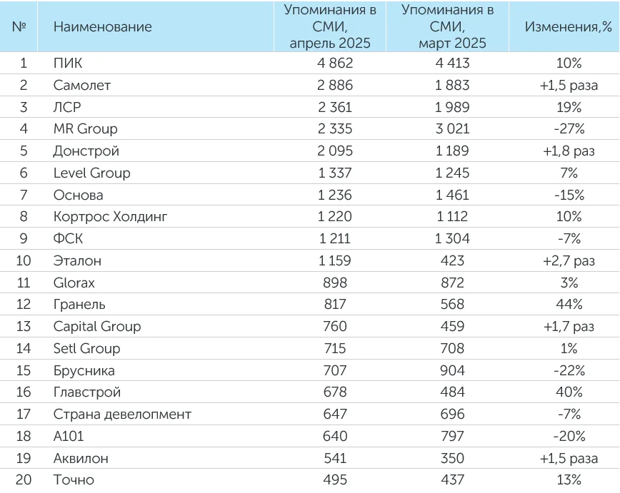 Система мониторинга и анализа СМИ и соцмедиа СКАН-Интерфакс совместно с онлайн-порталом «Строительной газеты» подготовили медиарейтинг девелоперских компаний за апрель 2025 года. В лидерах рейтинга свое присутствие сохранили ГК ПИК, ГК «Самолет» и «Группа ЛСР». Помимо данных компаний в ТОП-3 вошла ГК «Эталон».
