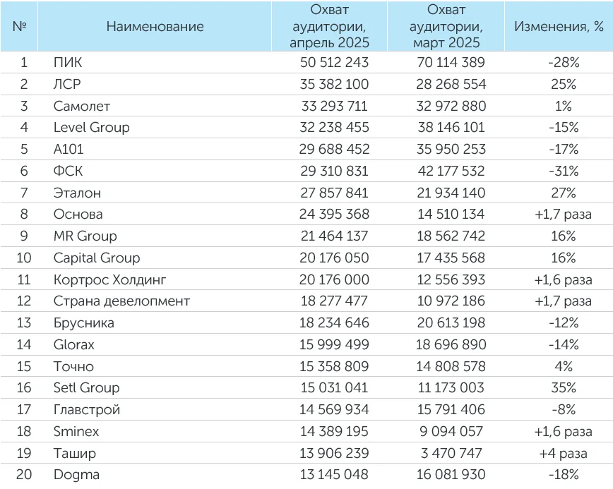 «Группа ЛСР» в апреле 2025 года заняла третье место по количеству упоминаний и второе место по охвату аудитории.