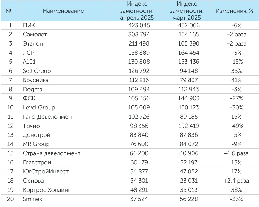 ГК «Эталон» заняла третье место по индексу заметности в апреле 2025 года с сообщением о том, что девелопер получил согласие кипрского регистратора на редомициляцию в Россию и подал документы для регистрации в специальном административном районе (САР) на острове Октябрьский в Калининградской области. Депозитарные расписки строительной группы на Московской бирже выросли на 5,63% на фоне этой новости.
