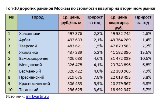 Элитные объекты в данный рейтинг не входили. Однако во всех районах ЦАО на вторичном рынке можно найти жилье и более демократичных сегментов. Например, в районах Хамовники и Арбат можно подобрать квартиру по цене бизнес-класса. Средняя цена «квадрата» в Хамовниках составила 497,4 тыс. рублей (первое место в рейтинге), в районе Арбат – 492,7 тыс. рублей (второе место). Средняя стоимость лота в районах-соседях практически не отличается – почти 50 млн рублей. На третьем месте район Тверской, показатели которого несколько занижают территории с внешней стороны Садового кольца.