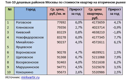 Самыми бюжетными в пределах МКАД стали Капотня (142,8 тыс. руб./кв. м; 7,4 млн рублей), Бирюлево – Западное (145,2 тыс. руб. /кв. м; 7,9 млн рублей) и Восточное (147,4 тыс. руб./кв. м; 8,3 млн рублей), Ивановское (150,2 тыс. руб./кв. м; 8,2 млн рублей) и Метрогородок (150,3 тыс. руб./кв. м; 8,1 млн рублей).