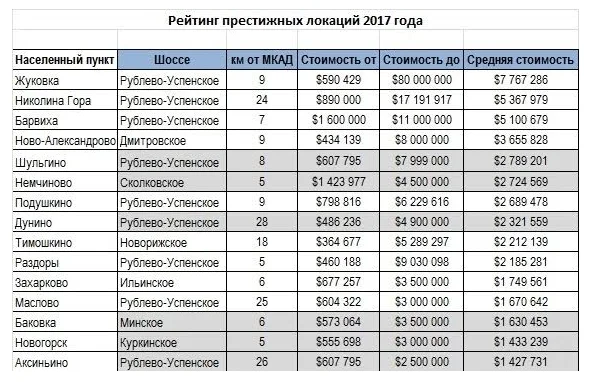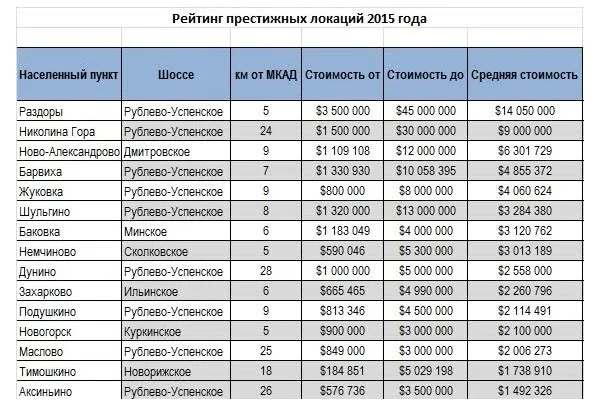 Элитные локации, где предлагается неорганизованная застройка соответствующего уровня, эксперты определили как населенные пункты, расположенные по престижным направлениям в зоне до 30 км от Москвы. Это не единственные критерии престижности. Места, которые попали в рейтинг, исторически считаются уникальными благодаря совокупности характеристик: транспортной доступности, окружающей застройки, экологии, живописности, ландшафту, наличию хвойного леса или большой воды.