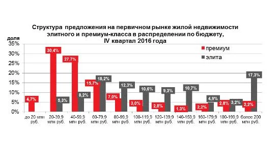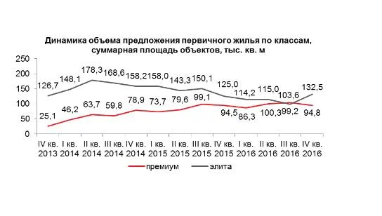 По итогам 2016 года объем предложения в элитном сегменте не покрывает спрос на квартиры минимальных площадей до 70 кв. м. Данную нишу занял премиальный сегмент.