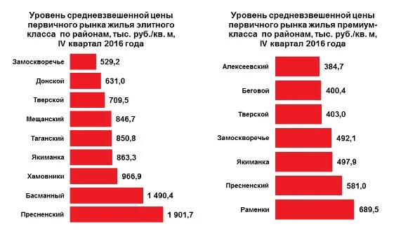 За год объем элитного предложения показал прирост на 6%, премиального – на 0,4%. По итогам 2016 года средневзвешенная цена на квартиры премиум-класса составила 513,8 тыс. руб./кв. м, за год она выросла на 0,9%. Цена в элитном сегменте снизилась на 5,2% до 919,2 тыс. руб./кв. м.