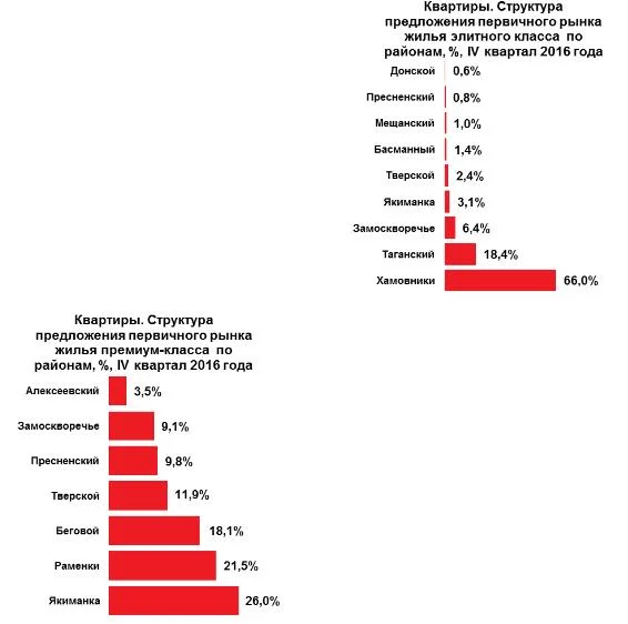 В премиум-классе наибольший объем предложения традиционно относится к району Якиманка – 26%. Год назад лидером был район Раменки.