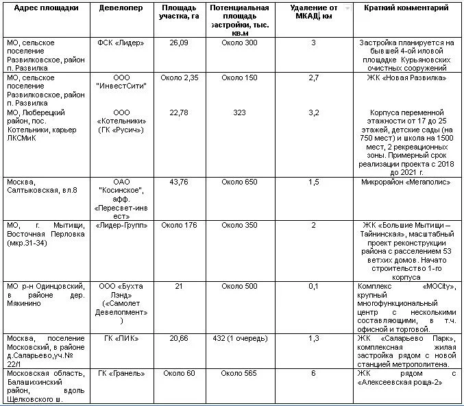 Ниже приведены перспективные площадки (за границами МКАД), которые находятся в высокой стадии предстартовой готовности. Уже в ближайшее время они будут выведены на рынок.