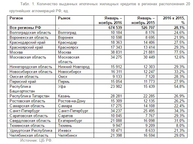 Одним из ключевых механизмов перезапуска экономического роста является снижение процентных ставок. В завершающемся году именно переход значений ставок по ипотеке в относительно комфортную для заемщиков зону (ниже 12,0% годовых для новостроек и ниже 13,0% на вторичном рынке) стал одним из ключевых стимулов развития рынка. Число выданных ипотечных кредитов в январе-ноябре 2016 года увеличилось на 28,1% по сравнению с аналогичным периодом 2015 года (в денежном выражении рост составил 32,3%). Наибольший рост был отмечен в Москве (+77,5%) и Башкортостане (+54,8%). Минимальные приросты в