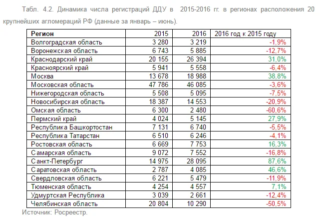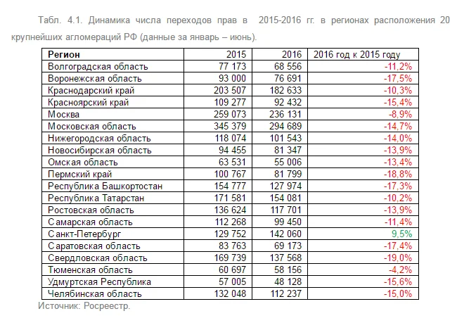 Несмотря на то, что статистика по числу и структуре сделок в едином массиве данных по всем регионам публикуется не так оперативно (к примеру, сейчас доступны сводные данные по числу сделок по 6 месяцам 2016 года), но общий тренд на изменение его структуры по сегментам рынка, тем не менее, очевиден. Общее восстановление рынка происходит, прежде всего, за счет сегмента новостроек. На вторичном рынке во всех анализируемых регионах (за исключением Санкт-Петербурга) в сравнении с периодом предыдущего года число переходов прав (тождественное числу сделок) падает, в то время как число регистраций договоров долевого участия в большинстве случаев растет (важно, что рост в десятки процентных пунктов отмечается в крупнейших рынках страны в Москве и Санкт-Петербурге).