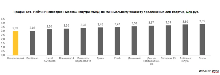 Аналитики ГК «Инград» составили рейтинг самого доступного предложения на первичном рынке столицы. При его расчете брались исключительно квартиры (без апартаментов) в жилых комплексах с учетом лотов «в брони». Возглавил рейтинг самых доступных новостроек ЖК «Лесопарковый» от ГК «Инград» (ЮАО, 200 метров от метро Лесопарковая), в котором можно купить квартиру-студию площадью 21 кв. метров за 2,99 млн рублей.