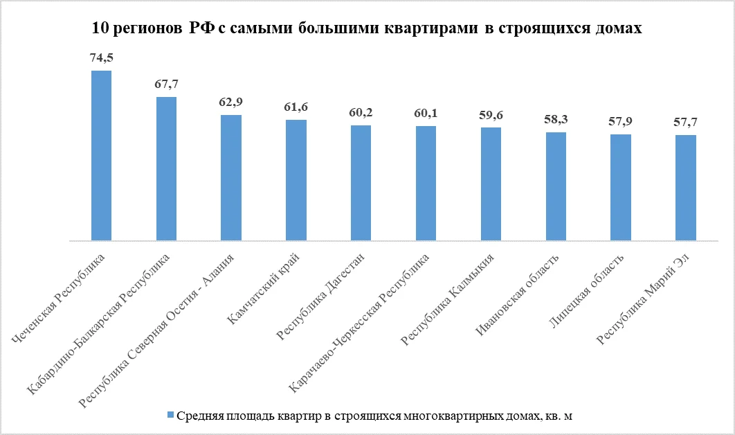 На уровне федеральных округов самыми маленькими оказались квартиры в Северо-Западном федеральном округе, где их средняя площадь составляет 44 кв. м. В Южном федеральном округе квартиры чуть больше — около 47 кв. м. Примерно одинаковая площадь квартир — около 49 кв. м — зафиксирована в Уральском и Дальневосточном федеральных округах. В Центральном и Приволжском федеральных округах квартиры в среднем имеют площадь около 51 кв. м. Самые большие квартиры строятся в Северо-Кавказском федеральном округе, где их средняя площадь достигает 59 кв. м. Таким образом, на Северном Кавказе среднестатистическая квартира почти на 10 кв. м больше (сопоставимо с площадью небольшой комнаты), чем в среднем по стране.