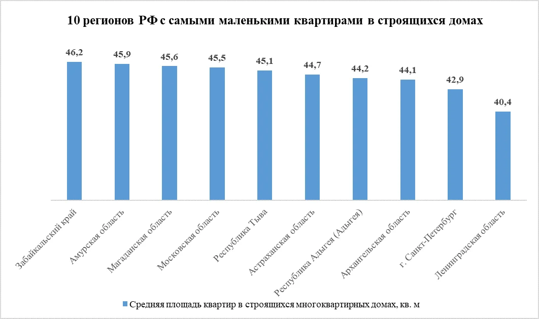 Если рассматривать ситуацию в разрезе регионов, то самые маленькие квартиры строят в Ленинградской области (40 кв. м), Санкт-Петербурге (43 кв. м) и Архангельской области (44 кв. м). Самые большие квартиры возводятся в Чечне (75 кв. м), Кабардино-Балкарии (68 кв. м) и Северной Осетии (63 кв. м).