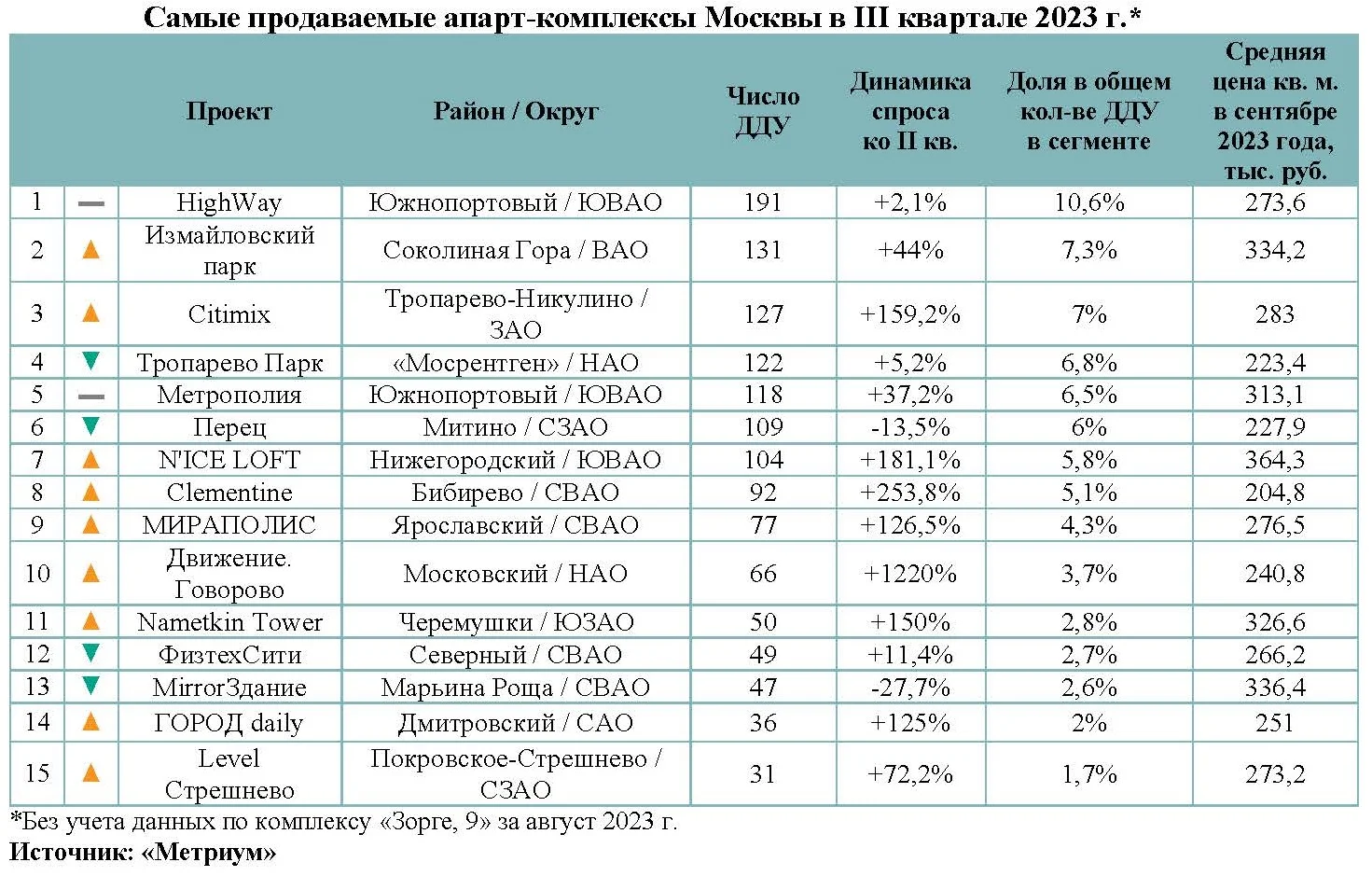 Формально самым продаваемым апарт-комплексом III квартала мог бы считаться проект бизнес-класса «Зорге, 9» от St Michael. Однако аналитики «Метриум» зафиксировали аномалию – 222 ДДУ в августе при среднемесячном темпе продаж в январе-сентябре 2023 года, равном 15 лотам. Поэтому данные по этому проекту за последний месяц лета были исключены из статистики, так как, вероятно, не отражают объективные показатели потребительской активности.