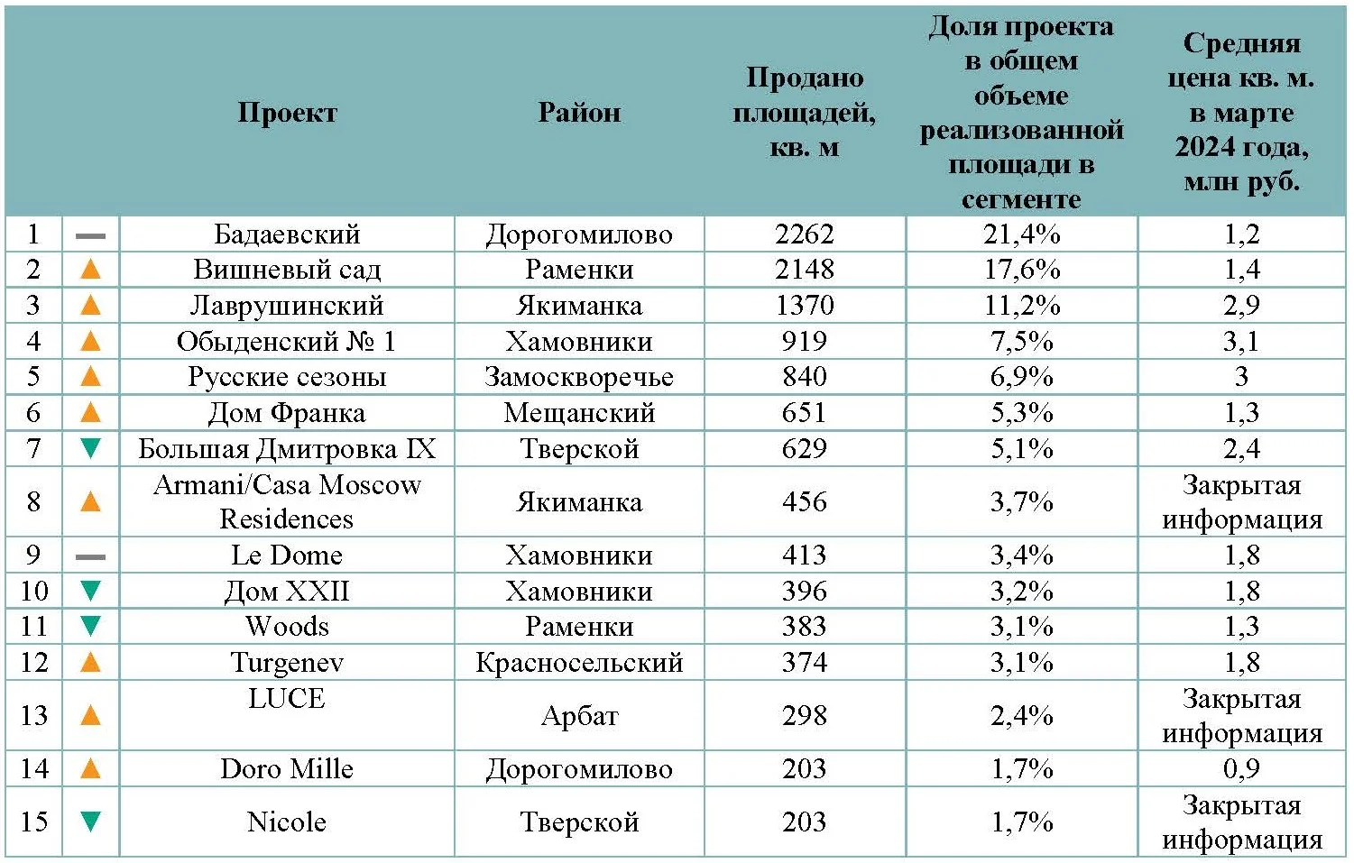 В течение I квартала 2024 года в премиальных проектах Москвы было продано 93,1 тыс. кв. метров первичного жилья – на 120,6% больше площади, реализованной в январе-марте 2023 года. При этом доля 15 самых востребованных проектов составила 71,2%. Состав топ-15 самых продаваемых новостроек премиум-класса за минувший квартал обновился на две позиции.