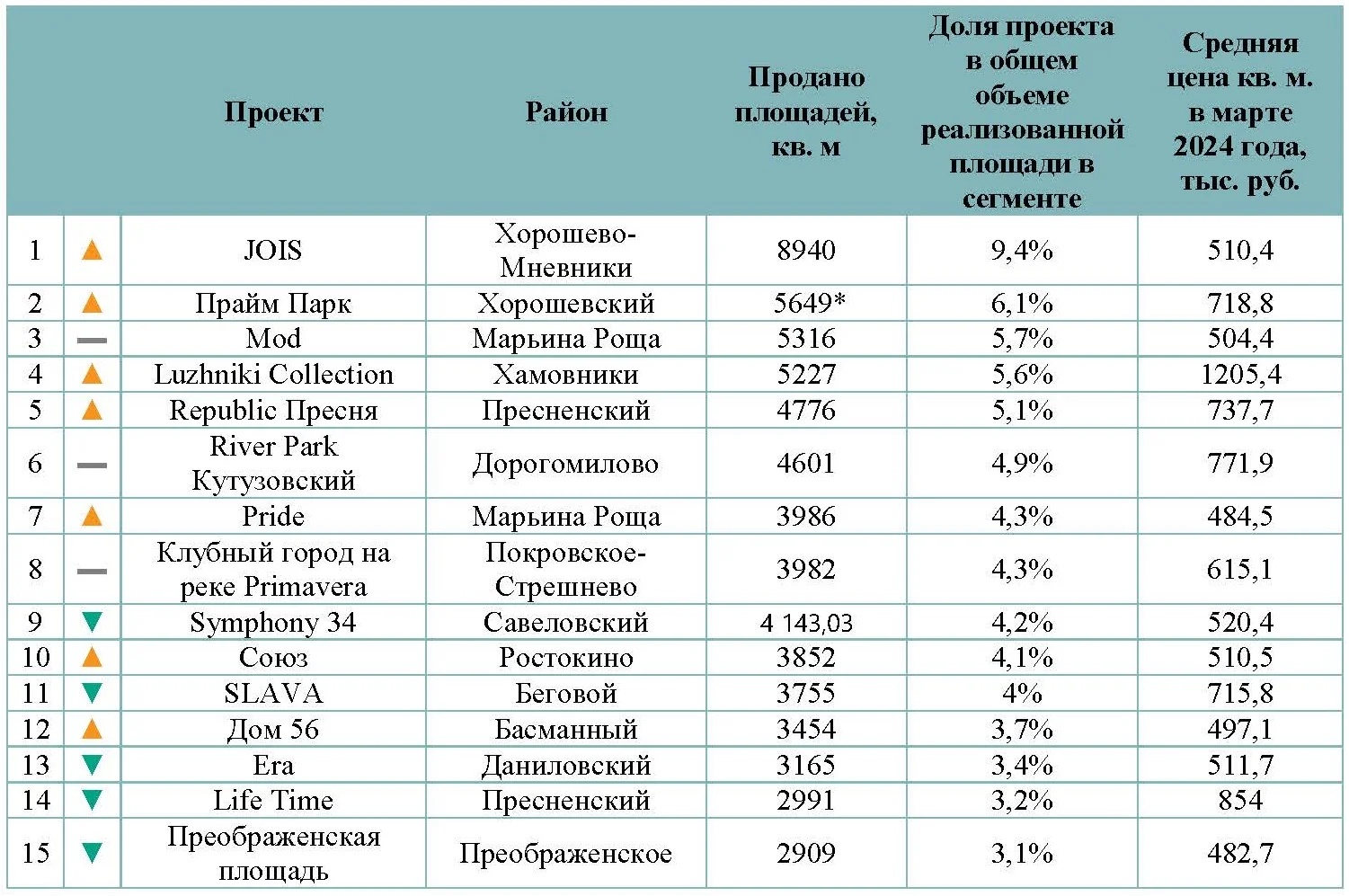 Новым лидером рейтинга стал его дебютант – жилой комплекс JOIS от MR Group. За I квартал 2024 года в нем продано 8718 кв. метров (9,4% от объема реализованной в сегменте площади). Средняя цена квадратного метра в проекте в марте 2023 года составила 510,4 тысяч кв. метров.