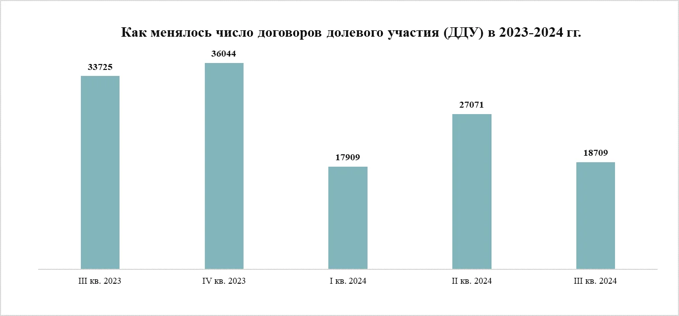 В сентябре 2024 года Росреестр Москвы зарегистрировал 6,4 тыс. договоров участия в долевом строительстве жилья (ДДУ), что на 27% больше, чем в предыдущем месяце, но на 53% меньше, чем в сентябре 2023 года (тогда рынок установил абсолютный рекорд, до сих пор не побитый, – 13,6 тыс. ДДУ). Всего за третий квартал 2024 года в Москве дольщики и застройщики заключили более 18,7 тыс. ДДУ, что на 45% меньше, чем в аналогичный период 2023 года.