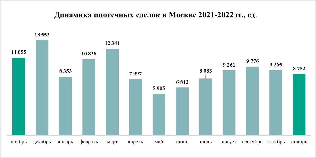 На рынке ипотеки тем временем спрос снова скорректировался. В ноябре банки выдали заемщикам 8,8 тыс. кредитов на покупку нового и вторичного жилья, что на 6% меньше, чем в октябре 2022 (9,3 тыс. сделок). Относительно ноября 2021 года количество сделок, зарегистрированных Росреестром Москвы в ноябре 2022 года, уменьшилось на 21%.