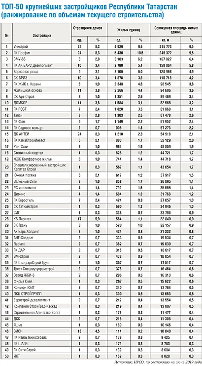 По состоянию на июнь 2019 года строительство жилья в Республике Татарстан вели 69 застройщиков (брендов), представленные 93 компаниями (юридическими лицами). Первое и второе места занимали компании «Унистрой» и ГК «Профит». Они возводили по 24 жилых дома (по 9,5% строившихся площадей). Правда, площадь квартир, возводившихся «Унистроем» (246,77 тыс. кв. м), была немного больше, чем у «Профита» (246,37 тыс. кв. м). Зато по количеству квартир впереди была ГК «Профит» — 5 430 против 4 929 у «Унистроя». На третьем месте располагалось СМУ-88, которое возводило 8 домов, или 6,4% площадей (167,83 тыс. кв. м).