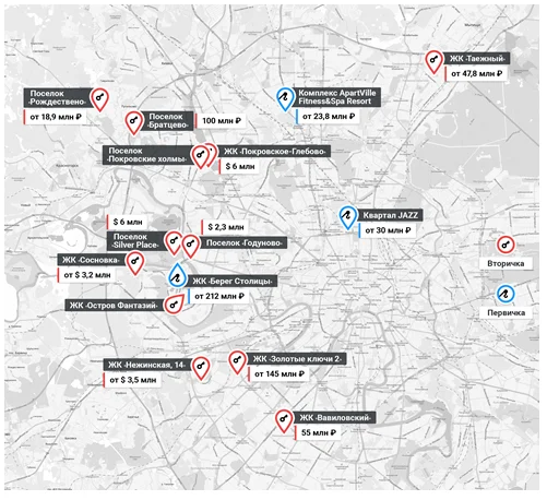 Специалисты департамента жилой недвижимости Penny Lane Realty составили подборку из 15 самых известных проектов с таунхаусами на территории Москвы. В этом исследовании эксперты объединили самые известные, схожие по характеристикам проекты с таунхаусами и составили карту их расположения на территории «старой» Москвы. Поскольку важным событием сегмента стало появление новых знаковых проектов, первичный и вторичный рынки разделены.