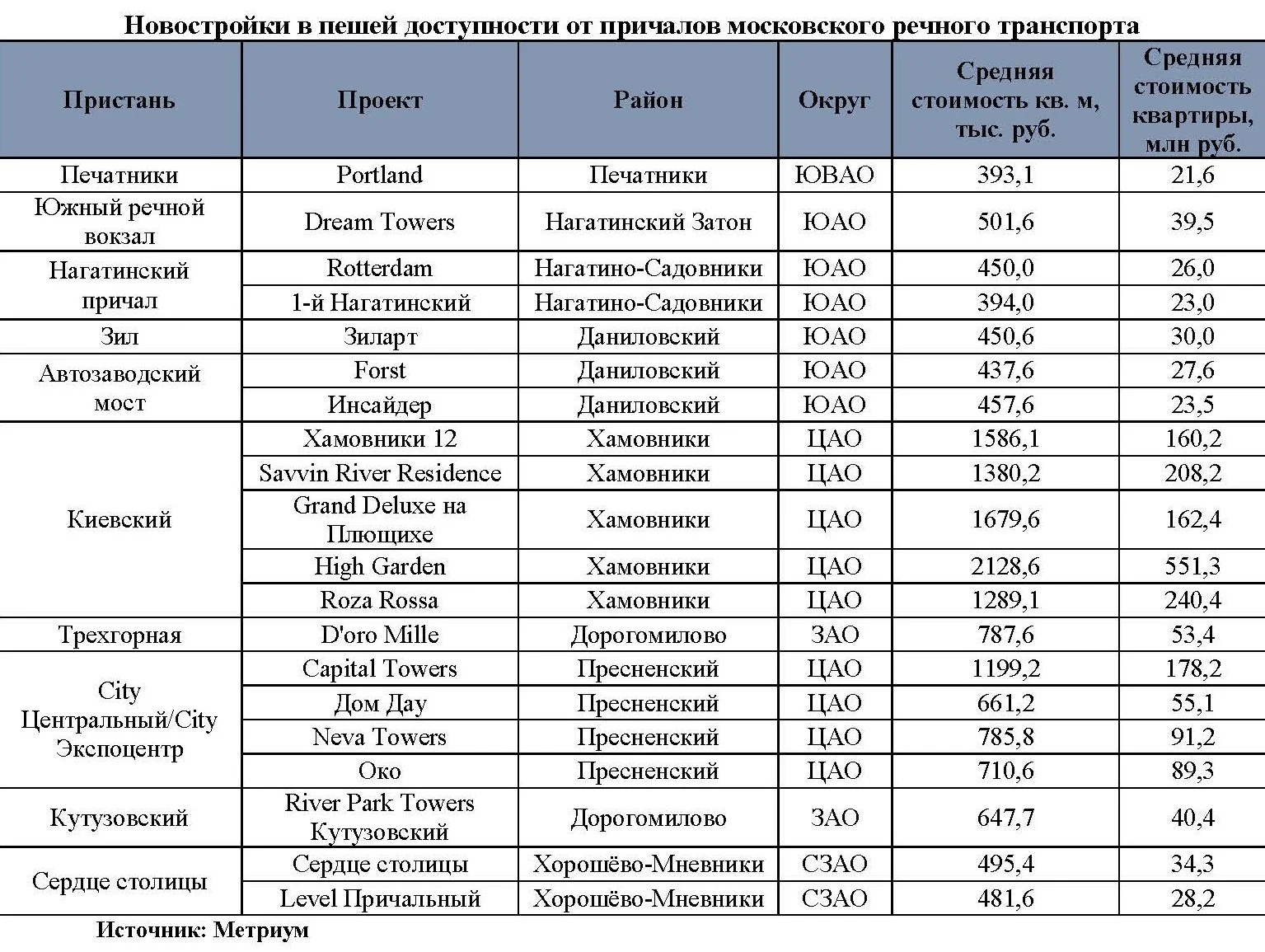Только один проект премиального класса можно найти на южном маршруте речного транспорта – жилой комплекс Dream Towers на полуострове Нагатинской поймы, который реализуется в 10 минутах ходьбы от недавно реконструированного Южного речного вокзала. Этот комплекс отличается и более доступной ценой, несмотря на премиальный уровень, – 502 тыс. рублей за кв. метр.