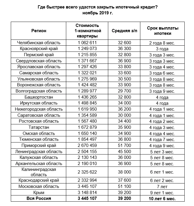 Меньше всего времени на выплату ипотеки при покупке однокомнатный квартиры потребуется в Челябинской области – 2 года 8 месяцев. На втором месте – Красноярский край, где полностью расплатиться с ипотекой можно за 3 года. Третье место занимает Пермский край: срок выплаты составит 3 года и 3 месяца.