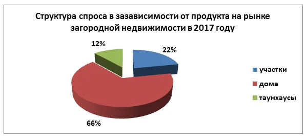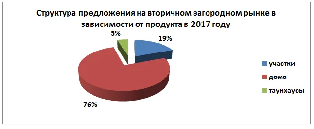 В структуре предложения, в зависимости от продукта, в 2017 году по сравнению с 2016 годом в 1,5 раза увеличилась доля таунхаусов, доля участков практически не изменилась, на 6% уменьшилась доля домов.