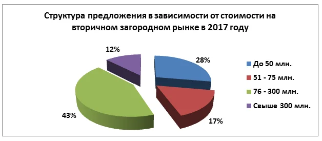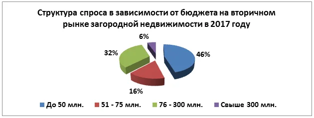 По сравнению с 2016 годом, в 2017 году на 5% увеличился спрос на объекты в диапазоне 75 – 300 млн рублей, на 5% увеличился спрос в диапазоне до 50 млн рублей, на 7% уменьшился спрос в диапазоне 51 – 75 млн рублей, и на 3% в диапазоне свыше 300 млн рублей. Средний бюджет в 2016 году на вторичном загородном рынке достигал около 80 млн рублей, в 2017 году - около 88 млн рублей.