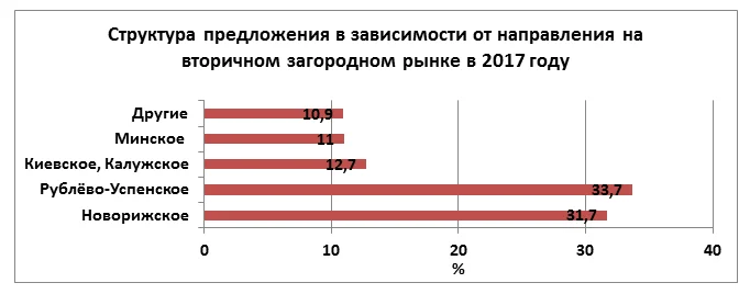 Структура предложения на вторичном рынке загородной недвижимости Подмосковья за год не изменилась. По данным аналитиков «Tweed Недвижимость», количество объектов увеличилось по сравнению с концом 2016 года на 6%, причем на Рублево-Успенском шоссе количество объектов увеличилось на 4,5%, на Новорижском направлении - на 10%. В результате количество вторичных объектов на Новорижском и Рублево-Успенском шоссе практически сравнялось.