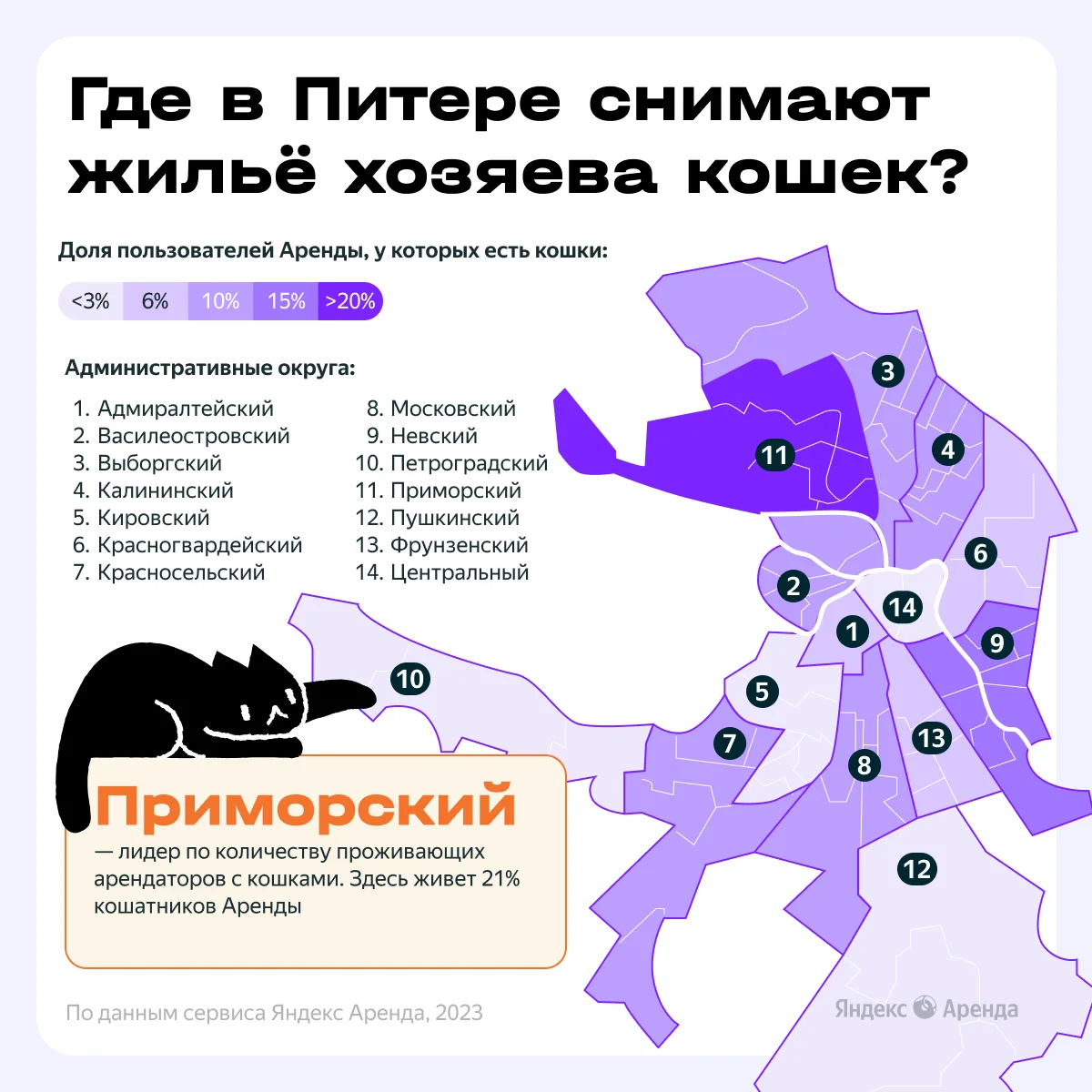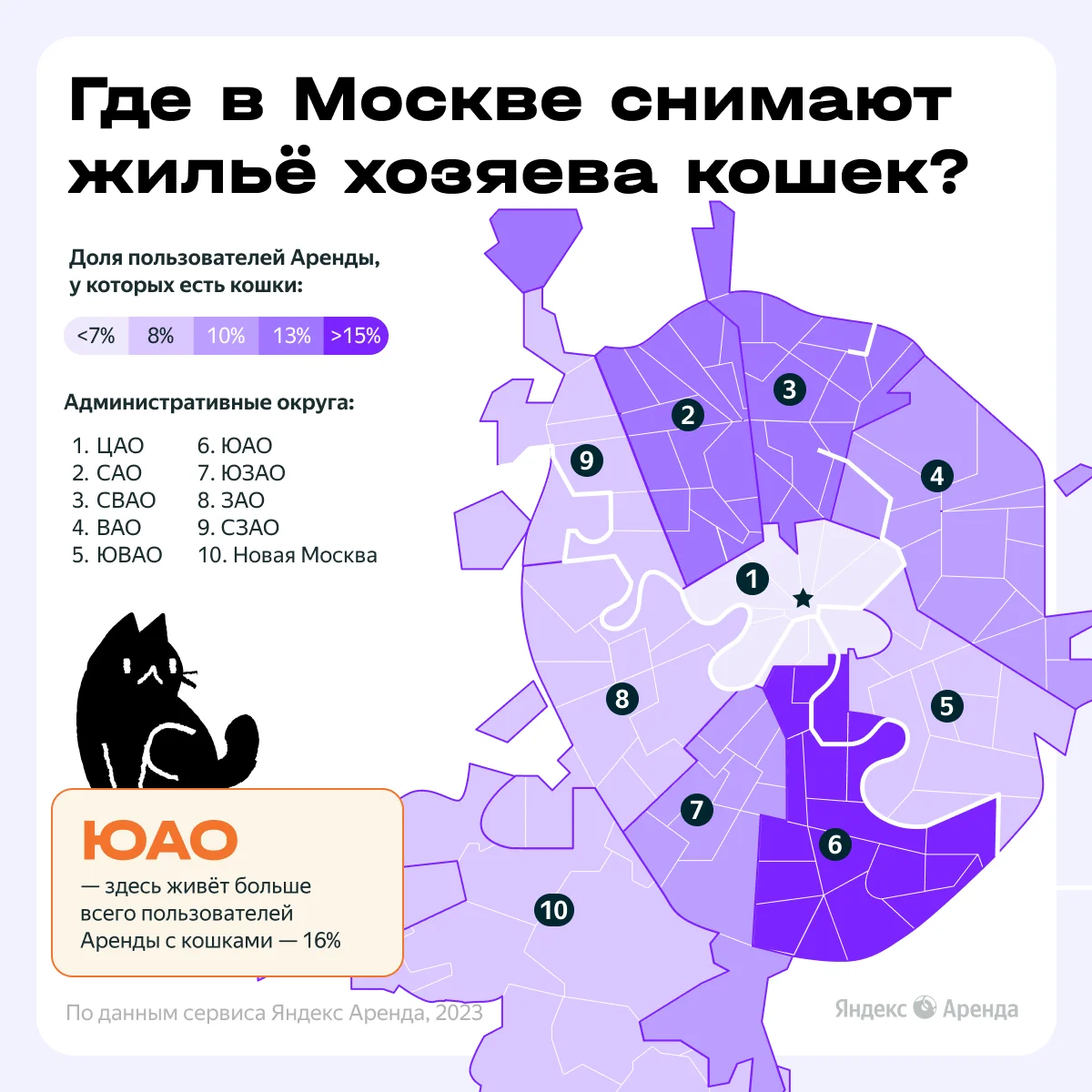 Владельцы кошек, как правило, проживают в квартирах на юге — в ЮАО, 16%. Чаще всего арендатора-кошатника можно встретить в Чертаново Южном и Нагатинском затоне.