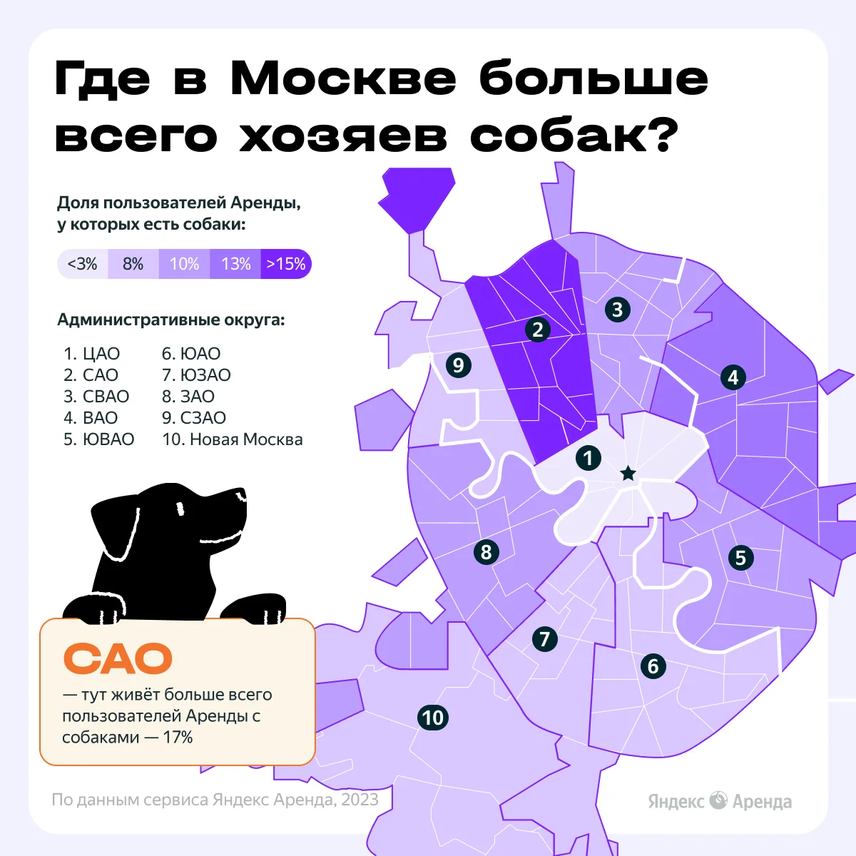 Согласно аналитике Яндекс Аренды за последние полгода, большинство арендаторов с собаками живет на севере Москвы, в САО — их там 17% от общего количества. Самые «густонаселенные» районы — Головинский и Западное Дегунино.
