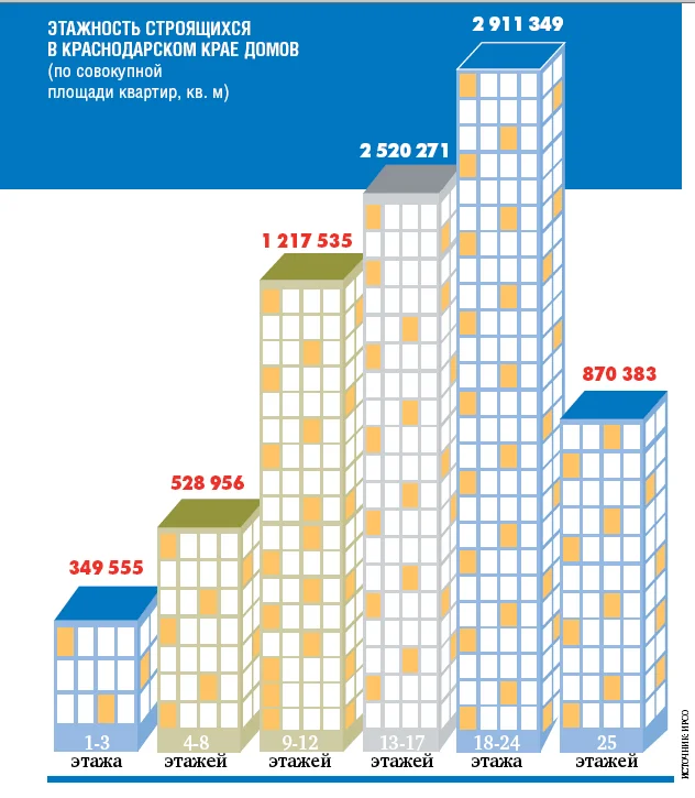 Средняя этажность жилищного строительства в Краснодарском крае составляет 11,2 этажа (из расчета на строящийся дом). При том, что больше всего в регионе строится сейчас 1-3-этажных зданий — 287 (28,8% всех местных новостроек). Однако если не брать в расчет такой показатель, как количество домов, а сравнить их по «качественным характеристикам» (общему метражу), то наибольший объем будет приходиться уже на 18-24-этажные строения. И пусть таковых в крае возводится 190 штук (19,1% строящихся домов), зато на их счету 2 911 349 «квадратов», а это уже 34,7% от всей жилой площади, в то время как общая площадь столь многочисленных малоэтажек составляет всего 349 555 кв. м, или лишь 4,2% всего метража (подробности — в инфографике).