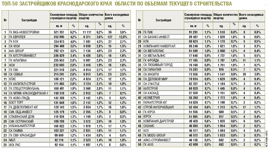 В общей сложности на рынке новостроек Краснодарского края представлено сейчас 178 застройщиков. При этом почти половину регионального рынка (45,2% всех площадей) контролируют всего 15 крупнейших девелоперов (ТОП-50 по объемам текущего строительства представлен в таблице). «Пальму первенства» в крае держит ГК «ВКБ-Новостройки», в портфеле которой сейчас свыше 521 тыс. кв. м жилья (6,2% от общего объема возводимых «квадратов»). В тройку лидеров, но уже с более значительным отрывом в общем «метраже» от фаворита, входят ГК «Европея» — 352 тыс. кв. м (4,2% площадей) и ГК «АСК» — 334 тыс. кв. м (4%).