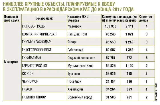 Самое скромное в крае жилье сейчас представлено в городе Горячий Ключ в жилом комплексе (ЖК) «Лесной» (застройщик СК «Терем») — средняя площадь квартиры здесь равна 20,5 кв. м. Самые большие квартиры в регионе появятся в Краснодаре — в доме по улице Буденного, который возводит стройкомпания «НСИ» — 211,5 кв. м. Что касается самих новых ЖК, то их в Краснодарском крае сейчас строится 294. В состав самого крупного из них — ЖК «Губернский» (девелопер «ЮгСтройИнвест»), расположенного опять же в краевом центре, входит 13 домов на 5272 квартиры совокупной площадью 234 869 кв. м. Ближайший «преследователь» — застройщик СК «Семья» — хоть и возводит «по соседству» в своем ЖК «Светлоград» сразу 25 домов на 6013 квартир, но проигрывает лидеру по общей площади почти 15 тыс. «квадратов». Самый «миниатюрный» (по своим масштабам) краснодарский ЖК — «Оазис», где стройхолдинг «Альянс Вега Билдинг» запланировал к сдаче три дома всего на 90 квартир (3432 кв. м).