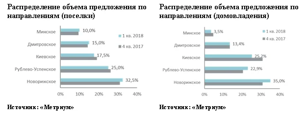 К концу первого квартала 2018 года на первичном рынке загородной недвижимости московского региона было представлено 40 поселков с общим объемом предложения около 890 домовладений, при этом за отчетный период выборка сократилась на 13,2%. По данным компании «Метриум», такое значительное снижение вызвано как вымыванием предложения, так и выводом из продажи лотов по ряду проектов. При этом за квартал рынок не пополнился ни одним новым объектом.