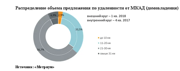 Превалирующий объем предложения на первичном рынке загородной недвижимости сосредоточен в поясе удаленности 21-30 км от МКАД (56,7%; -1,7 п.п.), отмечают эксперты. Треть выборки (33,5%; +1,8 п.п.) приходится на домовладения, расположенные в пределах 11-20 км от МКАД. Поселки, находящиеся на расстоянии 31-35 км и до 10 км от МКАД, занимают 6,9% (0,0 п.п.) и 2,9% (-0,1 п.п.) соответственно.
